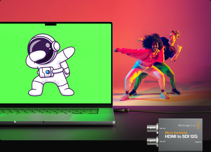 如果要将计算机图文连接到ATEM Constellation,就可以使用Micro Converter HDMI to SDI转换器。采用直接和完全数字化的连接方式,能确保非常高的传输品质!如果您使用绿屏背景创建图文,还能借助ATEM Advanced Keyer高级键控在实时背景上合成标题。计算机也能成为相当实用的媒体播放器!